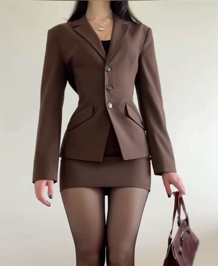 It is single-breasted with a slim, tailored fit that cinches at the waist, creating a defined silhouette