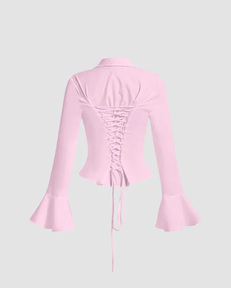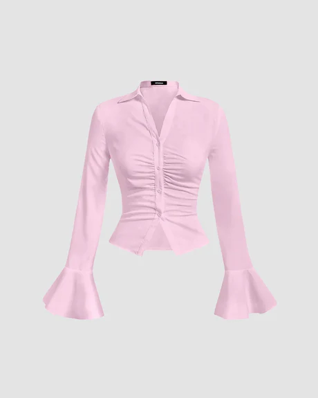 Introducing our Ruched Button Down Flared Sleeve Shirt Top in Pink. This flared sleeve shirt gives a romantic upgrade to your everyday classics. Designed with ruched detailing through the front and dramatic flared cuffs, it brings structure, movement, and a soft pop of pink to your wardrobe.